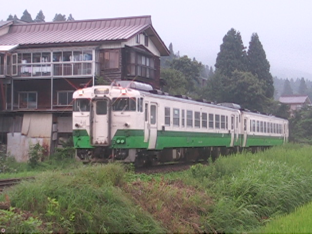 米どころの平野いちめんに広がる霧をかき分けるように、単行車がゆく…幻想的な朝の情感がよく出ていますね。 |