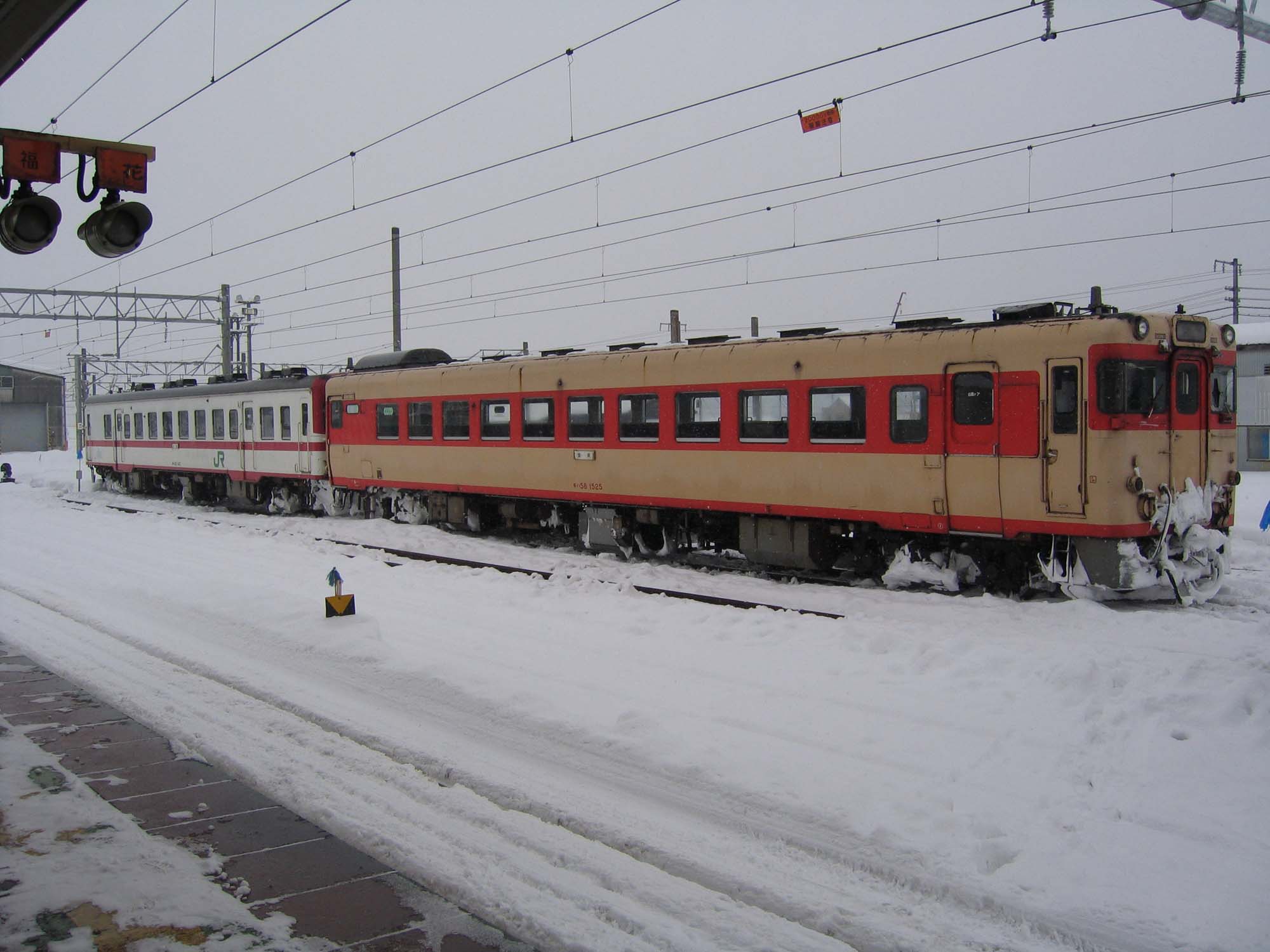 -(214 KB)あけましておめでとうございます.訪日中、今回初めて花輪線に乗りました.写真は大館で見た車両、キハ58 1500番台、キハ52 100番台(一枚窓)です.