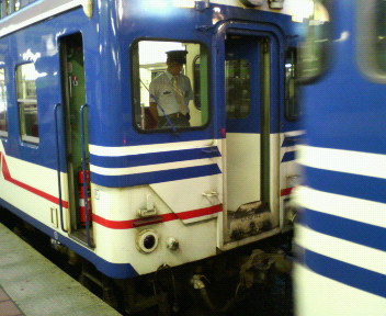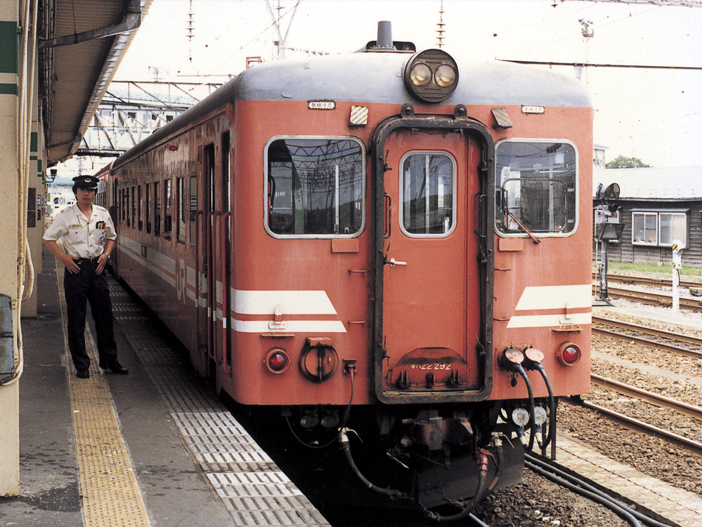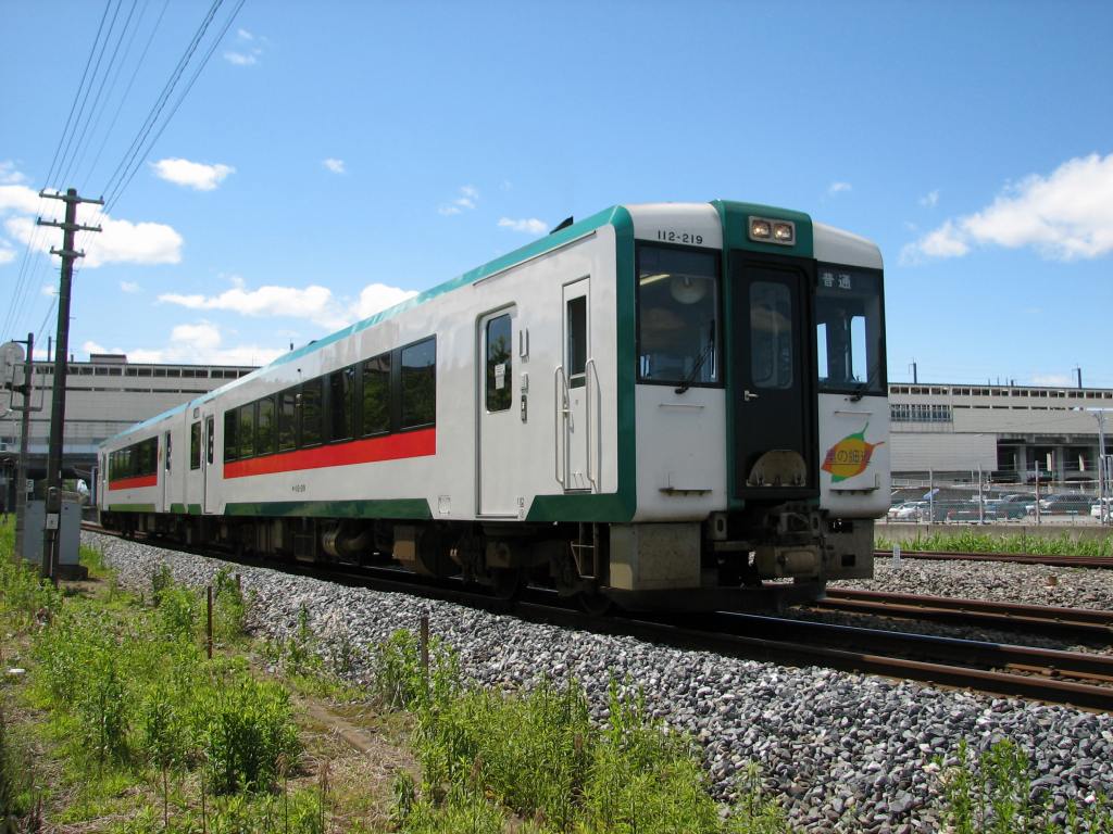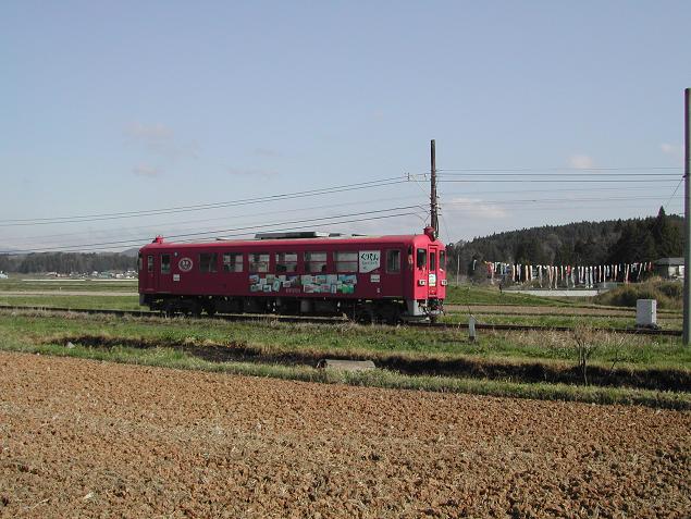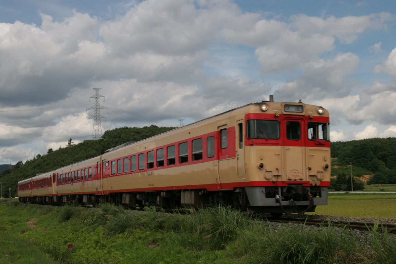 -(222 KB)花輪線の快速八幡平に充当された国鉄急行色4両です。この後に、キハ110(リクライニングシート)1両が大館方面に走っていきました。試運転幕を出していたので、水郡線の新車投入で捻出されるキハ110系が転入するのかもしれません。