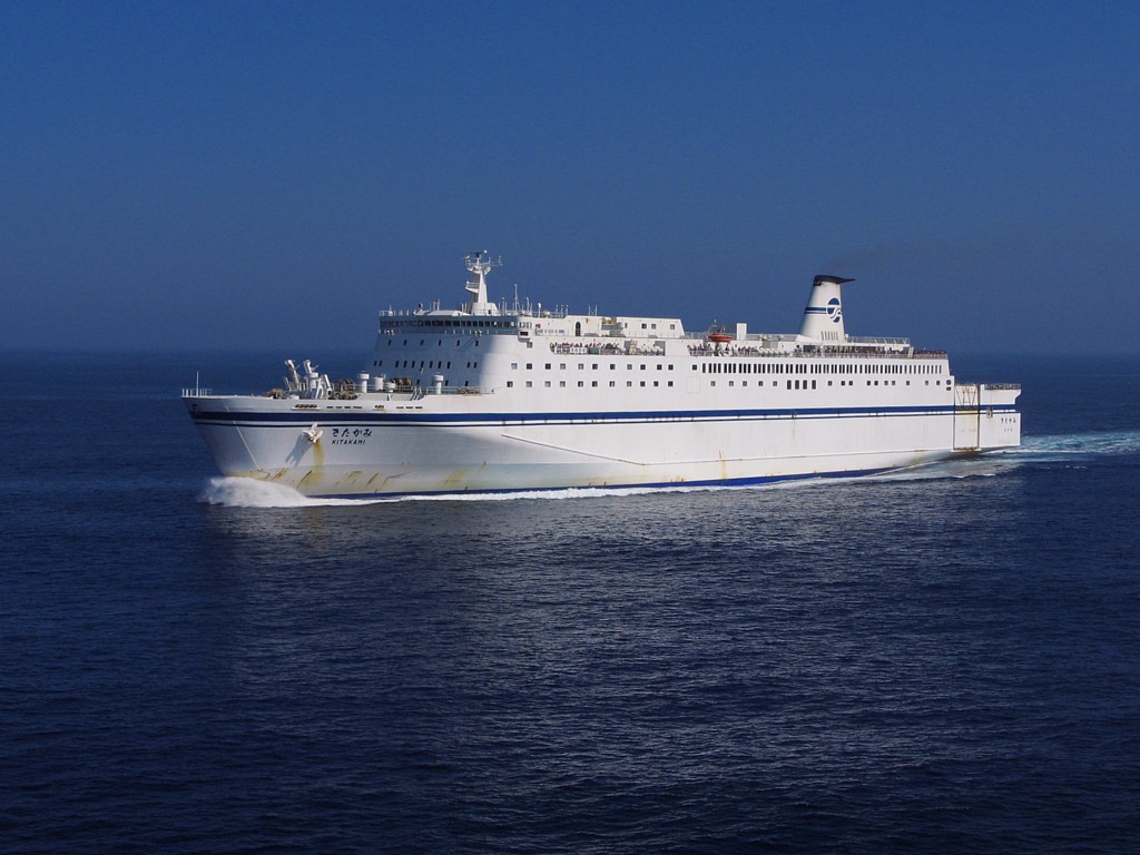 福島県沖で対航して汽笛を交わす日本屈指の豪華フェリー、名古屋行き「きそ」から相対速度80km/hで北上する苫小牧行き「きたかみ」をとらえました。
