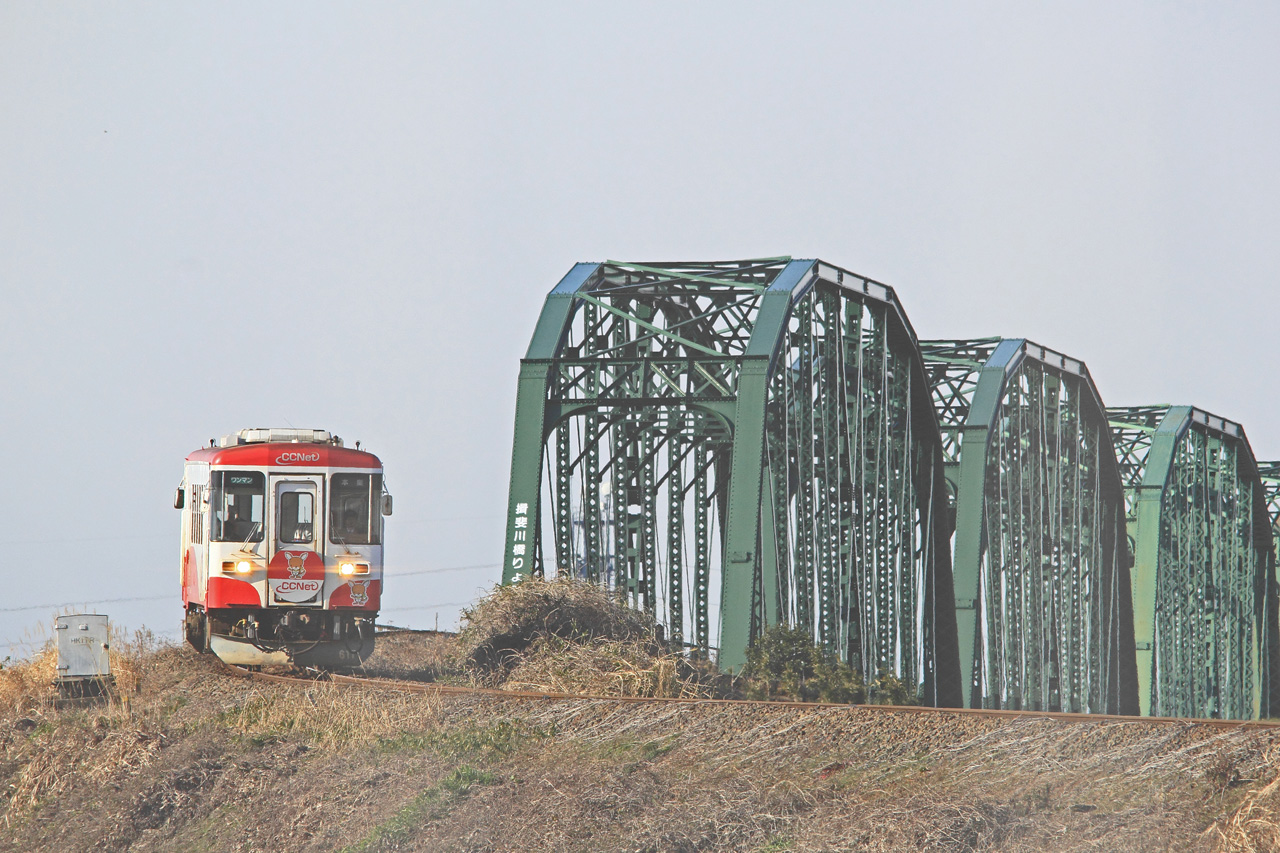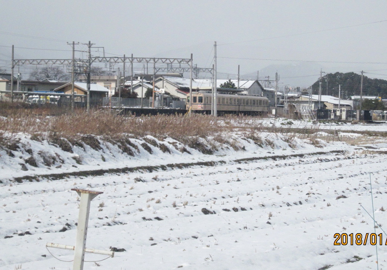 メガネ橋を通過して行く三重交通復活色 遠くに藤原岳を臨む 2018-01-08撮影