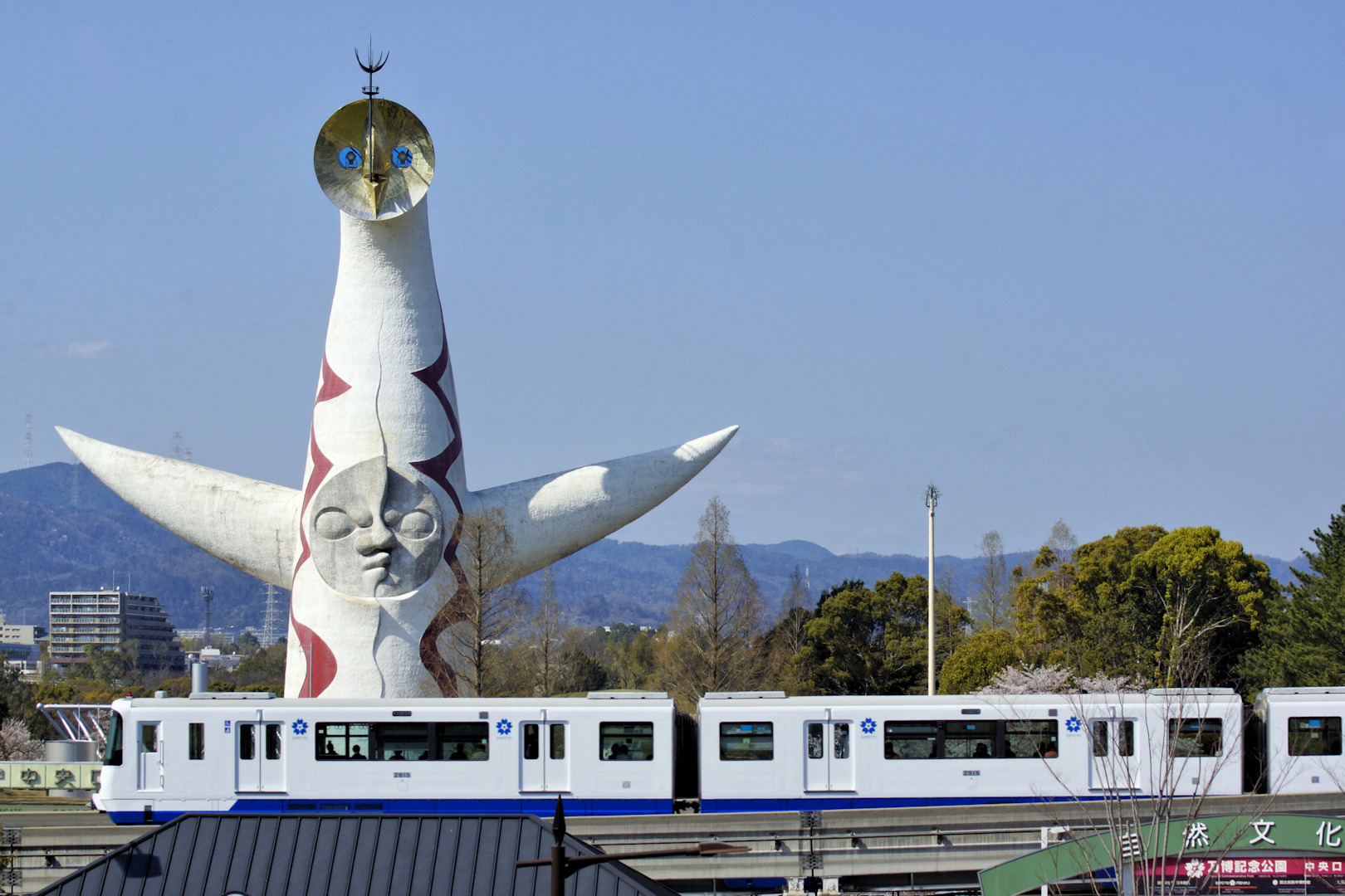 開業30周年記念企画の一環として、50年前の大阪万博会場内で走行していたモノレール車両を再現された「1970年大阪万博50周年記念ラッピング」2000系第15編成。