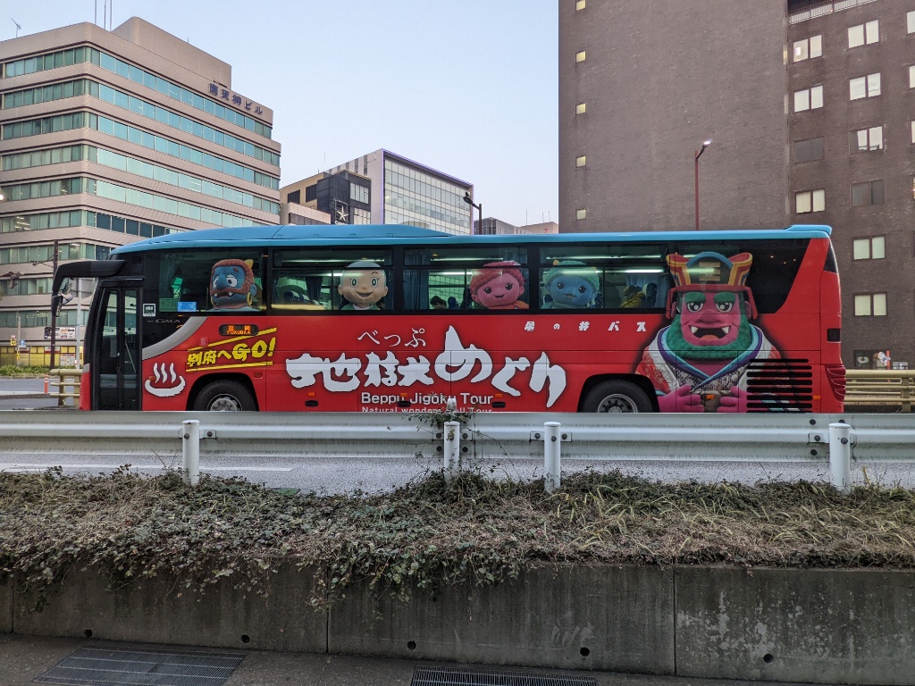 地獄めぐりラッピングバス。2022年3月8日 博多バスターミナル前にて
