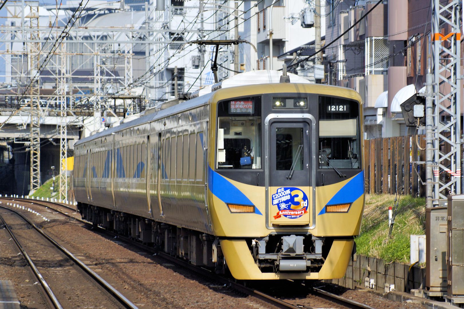 先月27日で営業運転されて3周年となり、3周年記念のヘッドマークを掲出した泉北12000系12021F。