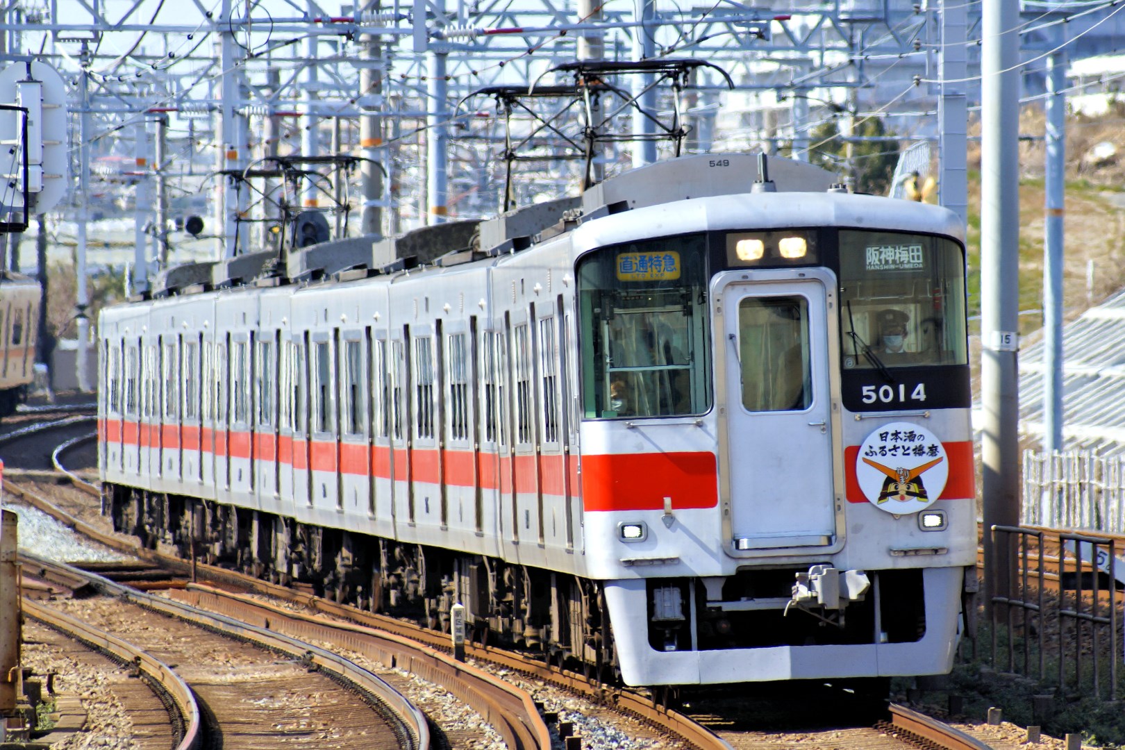 酒米の王様「山田錦」の生産地、播磨の日本酒の認知度向上に向けた取り組みとして、ヘッドマークを掲げた5000系5014F