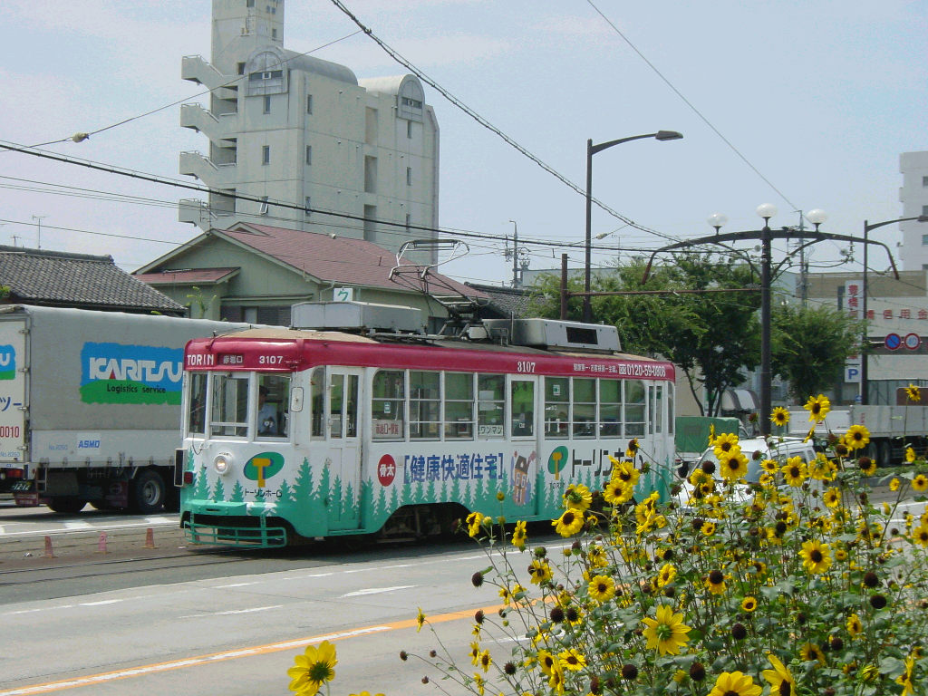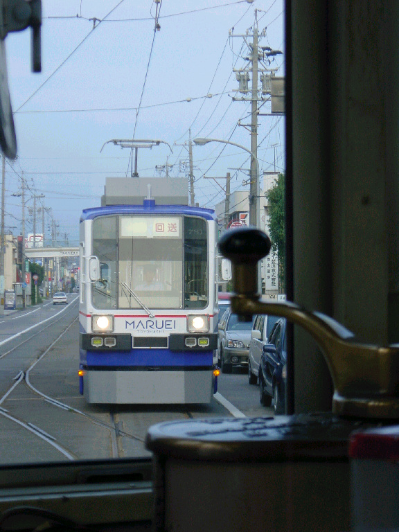 -(214 KB)車両交換しました。781号で井原のカーブを楽しんでいたら、18:40頃に無線が入り競輪場前で3107号に乗り換えとなりました。その後、転線できるところ(停留所名忘れました)まで続行して、戻っていきました。