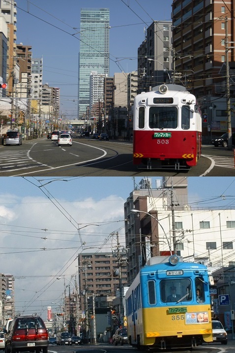 住吉分岐で阪堺1001形堺トラム「茶ちゃ」と「紫おん」の離合シーン