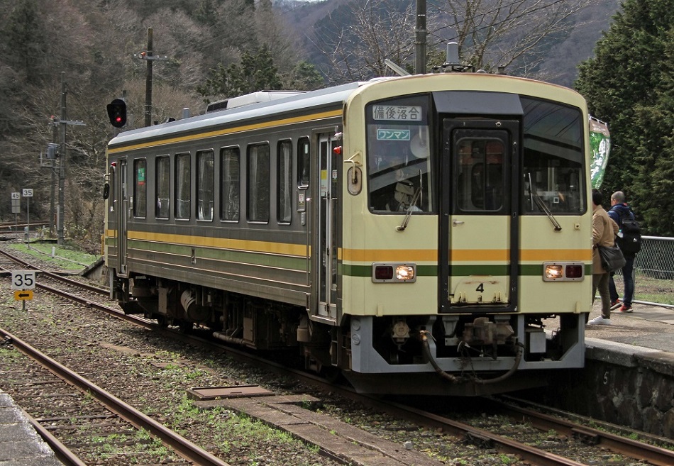 山陰本線「宍道駅」から山中の無人のジャンクション「備後落合駅」に到着木次線用の200番台車 備後落合駅 2017-4