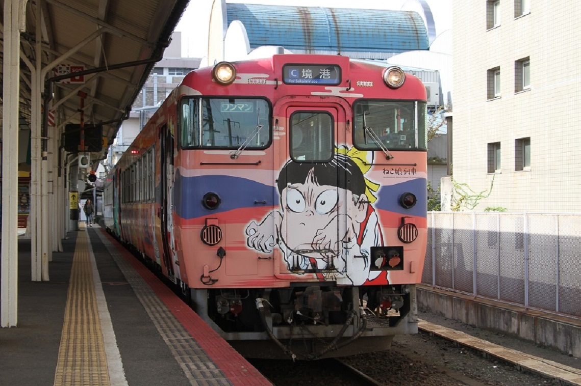 米子(鬼太郎)空港の滑走路拡張に伴い移設された区間を走る、境線のゲゲゲの鬼太郎ラッピング列車、キ ハ40形2000番台2095号車『ねこ娘列車』〔大篠津町〜米子空港間〕
