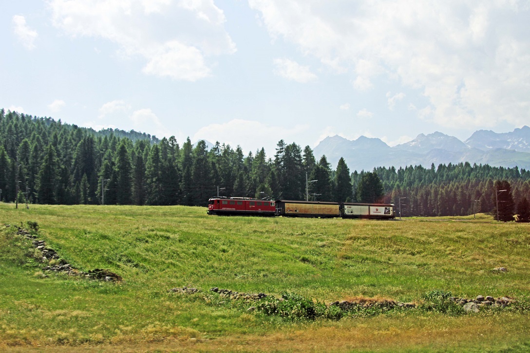 対象物が小さくてすみません、移動中の車窓からの撮影です。牽引機関車は恐らく Ge6/6型電気機関車と思われます。