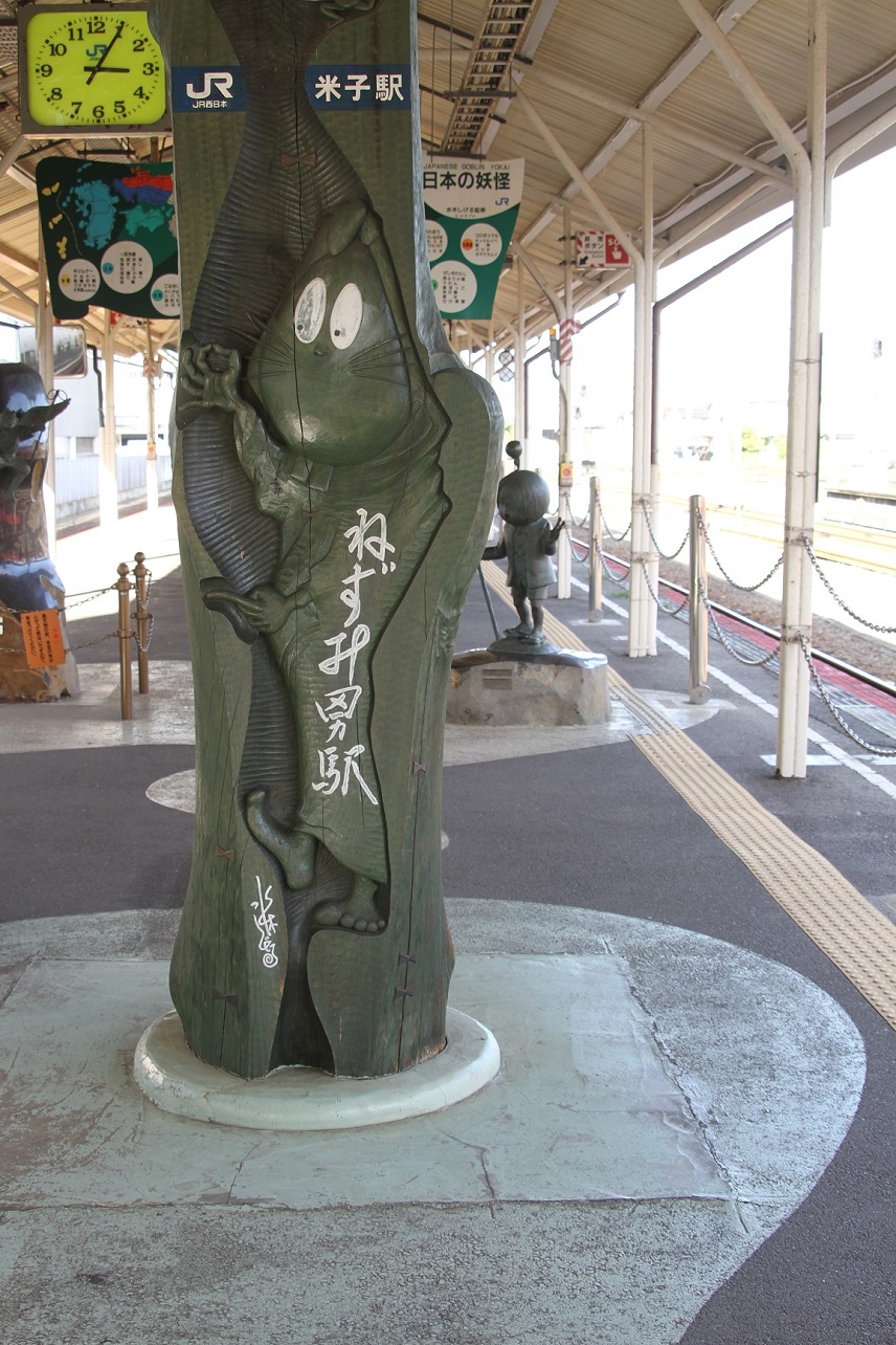 ねずみ男のオブジェの駅名標