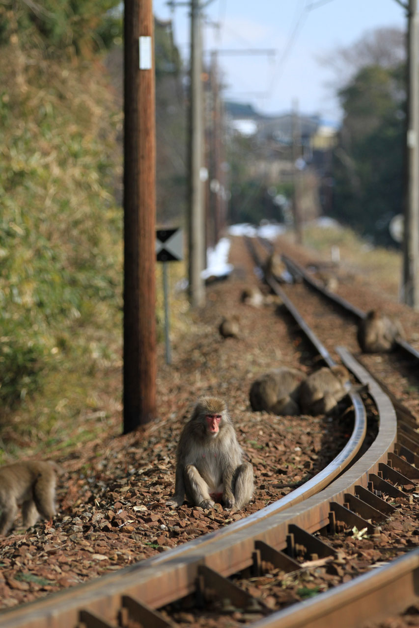 線路にサルの群れ。仲良く日向ぼっこ。でも、このサルたち、近隣の田畑を荒らして被害が出ているようです。当地に行かれる時は食べ物は車の中に・・です。2016/01/27