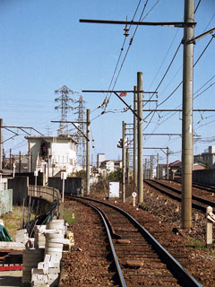 田神線にあった600V−1500V切替り地点のデッドセクション。 美濃町線から新岐阜駅(現名鉄岐阜)直通のため、各務原線1500V区間と美濃町線600Vが交わる田神線の田神〜市ノ坪間でデッドセクション(無電区間)が設けられていた。 無電区間の延長は約30mで、その間運転士はマスコンを切にして通過する。切替えは自動である。この区間はモ600・モ800・モ870・モ880の複圧車が使用され、美濃町線内用のモ590形などは入線しなかった。 田神線廃止後は各務原線との接続ポイントが撤去され、デッドセクション区間も役目を終えた。 関連リンク:田神線 各務原線 田神駅 市ノ坪駅 デッドセクション周辺地図(マピオン) ![]() |
