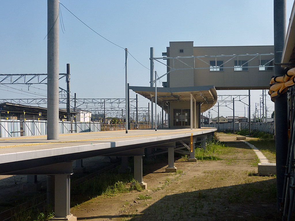 大正元年8月6日に開業。江南市南山町西に位置する。 構内には2面4線の他に数本の側線を持ち、廃車解体前の車両が長期留置される姿が見られた。 2009年より高架化工事が本格的に始まり、2010年10月には歴史のあった旧駅舎が解体された。 現在は仮地平ホームが姿を現し、仮線の敷設待ちの状態である。 |