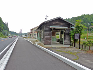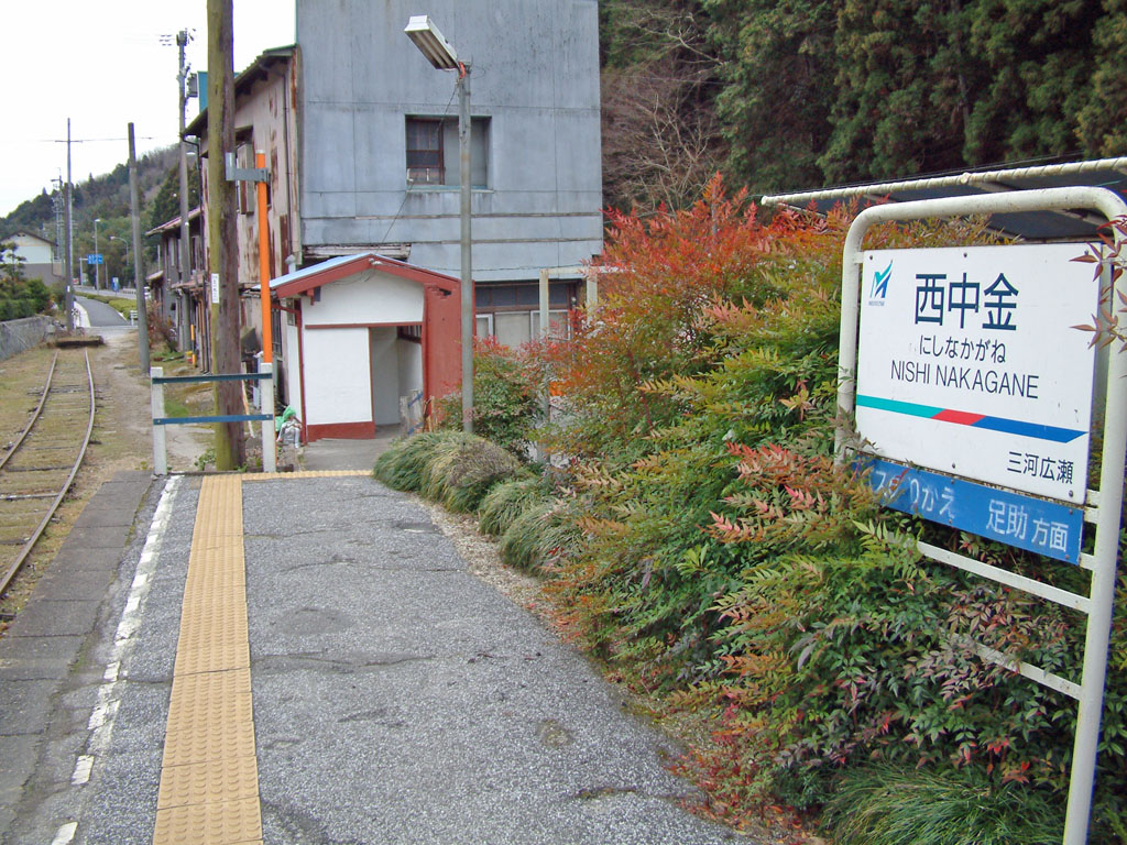 1928年(昭和3)1月22日開業。1985年(昭和60)5月1日にに無人化された。 長らく足助方面への連絡駅として重要な役割を果たしてきたが利用客が激減、レールバス・無人駅化などで耐え忍んできたが、残念ながら2004年3月31日をもって廃止された。 西中金から足助に連絡していた名鉄バスも廃止され、地元タクシー会社によるコミニュティバスに委託され、現在はおいでんバスに発展している。 2006年に国の登録有形文化財となり、2014年の道路拡張で駅舎の移設・周辺整備が行われ、駅周辺が変貌している。 |