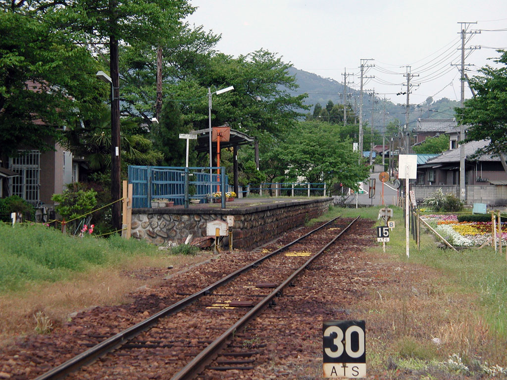 岐阜県加茂郡八百津町に位置した、名鉄・八百津線の終着駅。 1面1線の簡単な構内を有し、1984年(昭和59)に非電化となった。 2001年9月30日の八百津線廃止に伴い、役目を終えた。 現在、付近は住宅地化され、駅跡地には線路と石碑のモニュメントが残されている。 関連リンク:八百津線 |