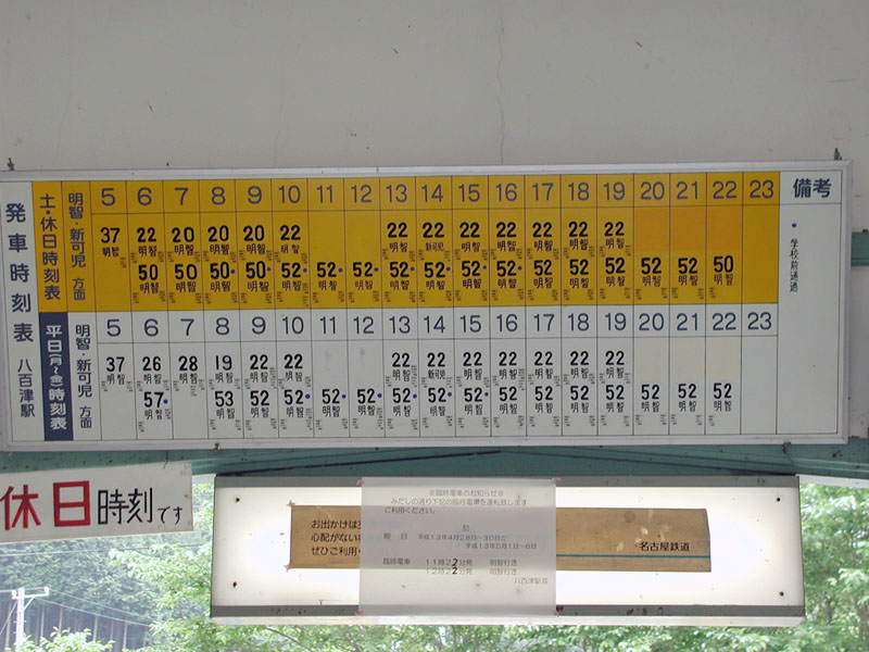 八百津駅舎(FREE)撮影日:[2001,5,4] SVGA XGA 八百津駅前(FREE)撮影日:[2001,5,4] SVGA XGA 八百津・改札口(FREE)撮影日:[2001,5,4] SVGA XGA 八百津・構内(FREE)撮影日:[2001,5,4] SVGA XGA 八百津・線路終端部(FREE)撮影日:[2001,5,4] SVGA XGA 終端部より明智方(FREE)撮影日:[2001,5,4] SVGA XGA 八百津・発車時刻表(FREE)撮影日:[2001,5,4] SVGA XGA 古レールを利用したホーム上屋(FREE)撮影日:[2001,9,29] SVGA XGA 八百津駅・手動井戸ポンプ画像提供:渋谷芳樹さん SVGA XGA 八百津・駅名板(FREE)撮影日:[2001,5,4] SVGA XGA |
